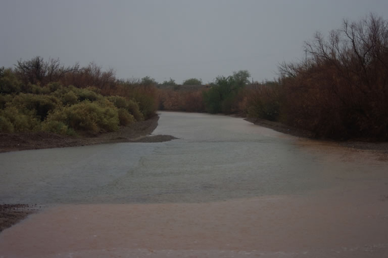 Cautiously, we drove the Refuge Suburban down the dirt road, retracing the route toward our trailhead, following a truck driven by a Refuge fireman. If he made it, we felt sure we could too. No more than a mile into the drive, water streamed across the road, a dry river bed no longer. With no place to turn around, we drove a quarter mile through the flowing current, following the fire truck, before re-emerging onto solid road surface for a short distance. Another wash loomed ahead of us.